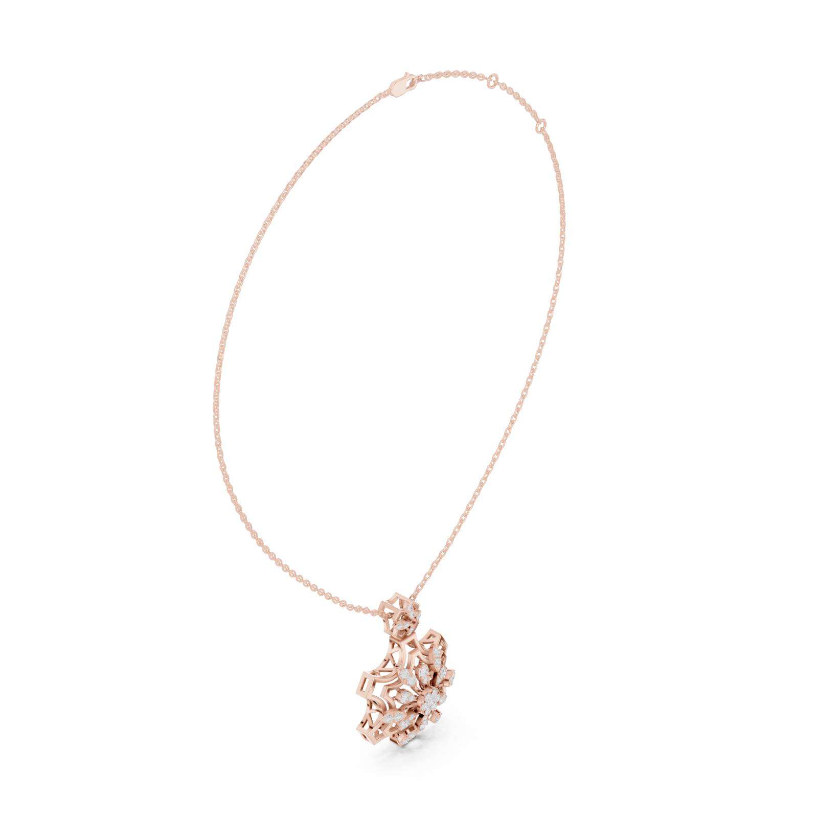 Moreover, the warm rose gold enhances the diamonds’ brilliance, providing a rich contrast that highlights the pendant’s modern, sculptural lines. Each diamond is carefully selected and positioned to maximize shine and ensure long-lasting beauty.