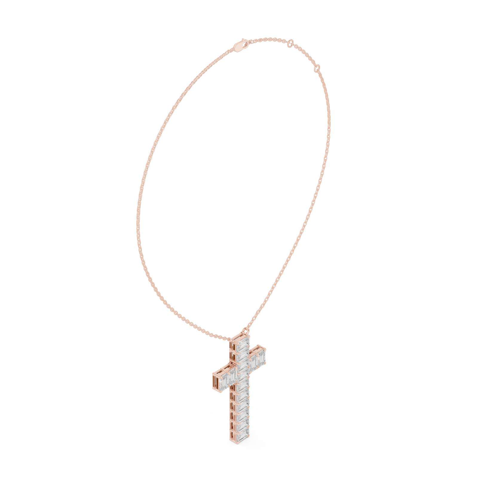 A modern Baguette Diamond Cross Pendant Necklace featuring sleek baguette-cut diamonds set in rose gold, also available in yellow gold and white gold.