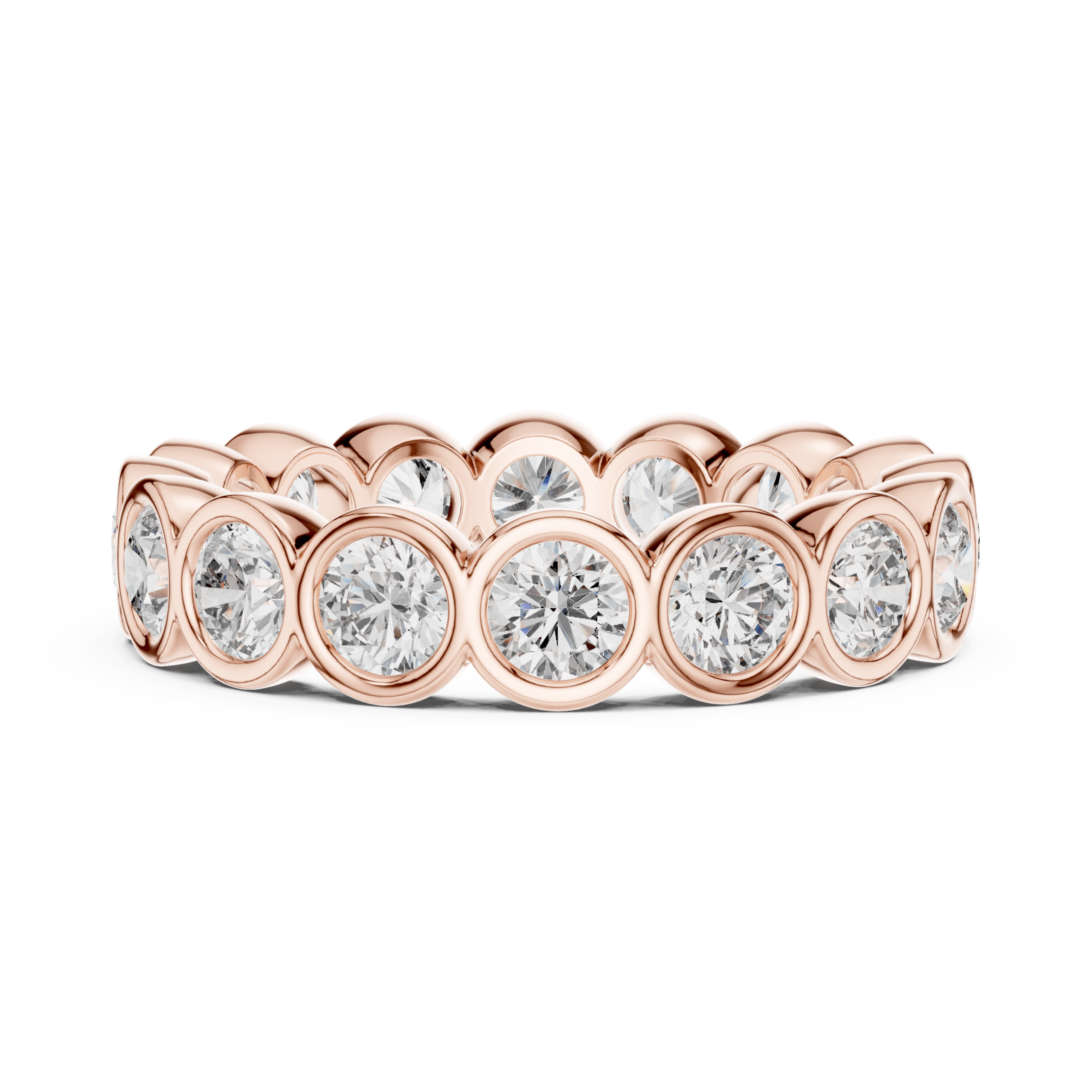 A secure and luxurious eternity band featuring round brilliant cut diamonds in polished full bezels. Available in 18K rose, white, and yellow gold. Ideal for weddings, anniversaries, or stacking.