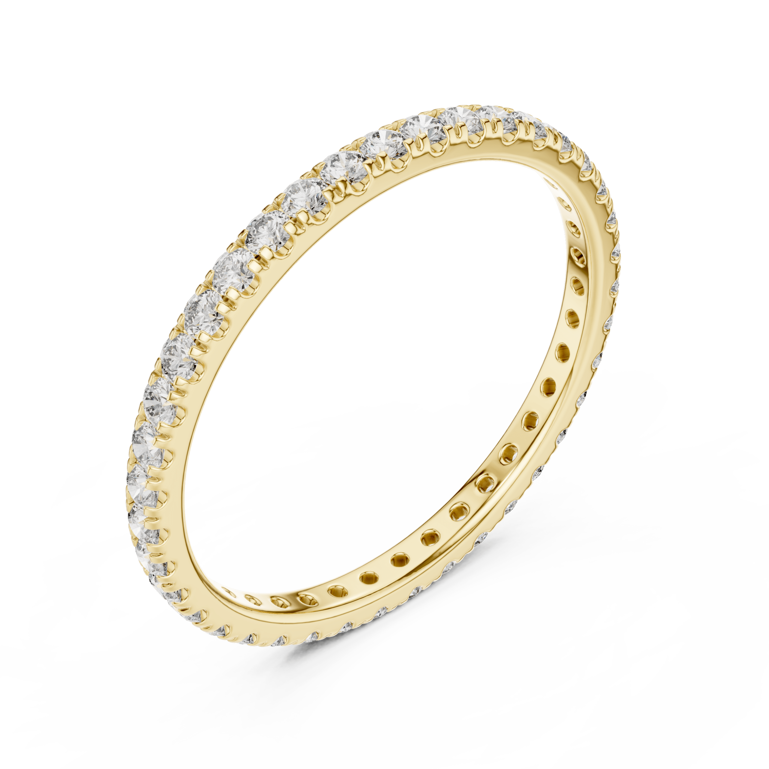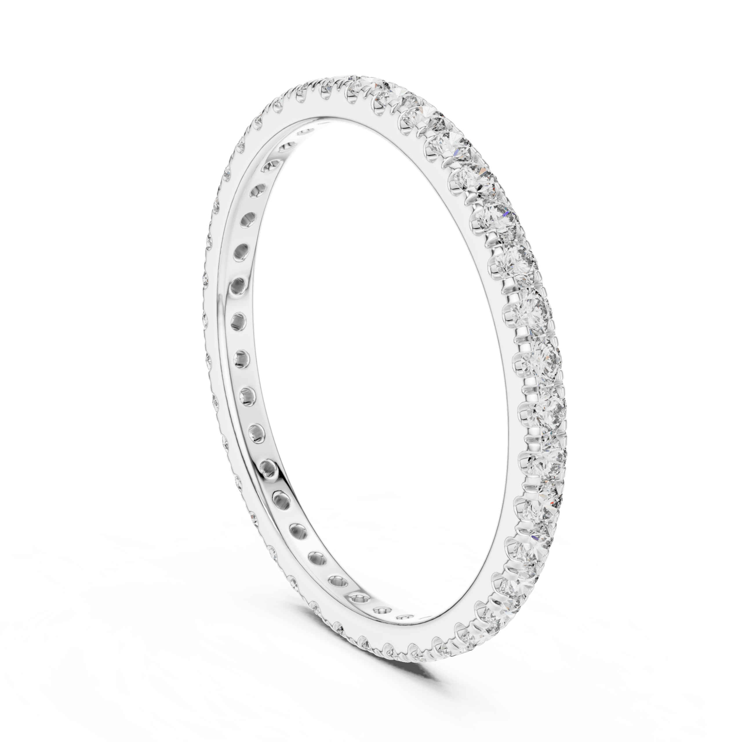 Skilled artisans set the diamonds in a fine micro-prong pavé setting. This technique places the stones closely together and creates a smooth, uninterrupted line of brilliance. The setting enhances sparkle while keeping the ring lightweight and comfortable on the finger.
