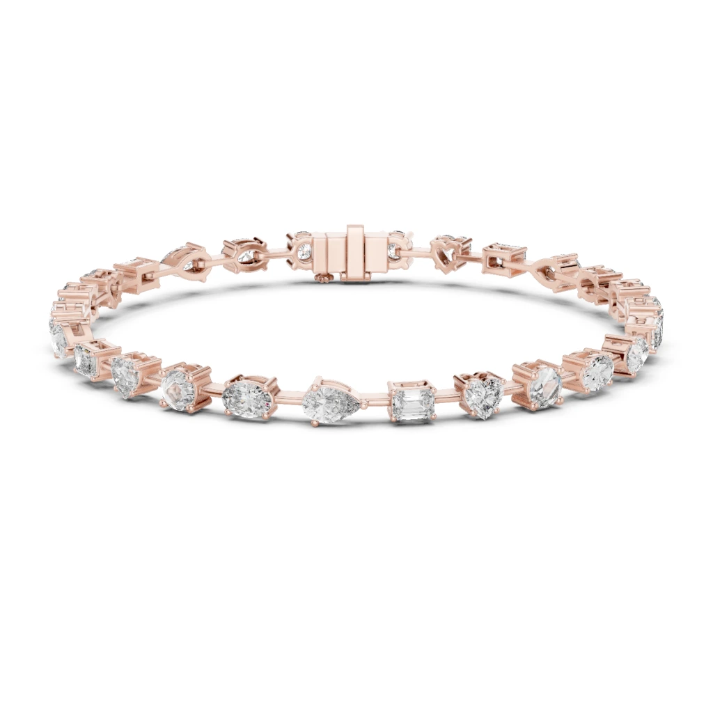 An artistic diamond tennis bracelet with round, oval, pear, emerald, and heart-cut diamonds set in 18K Rose Gold. Also available in White and Yellow Gold.