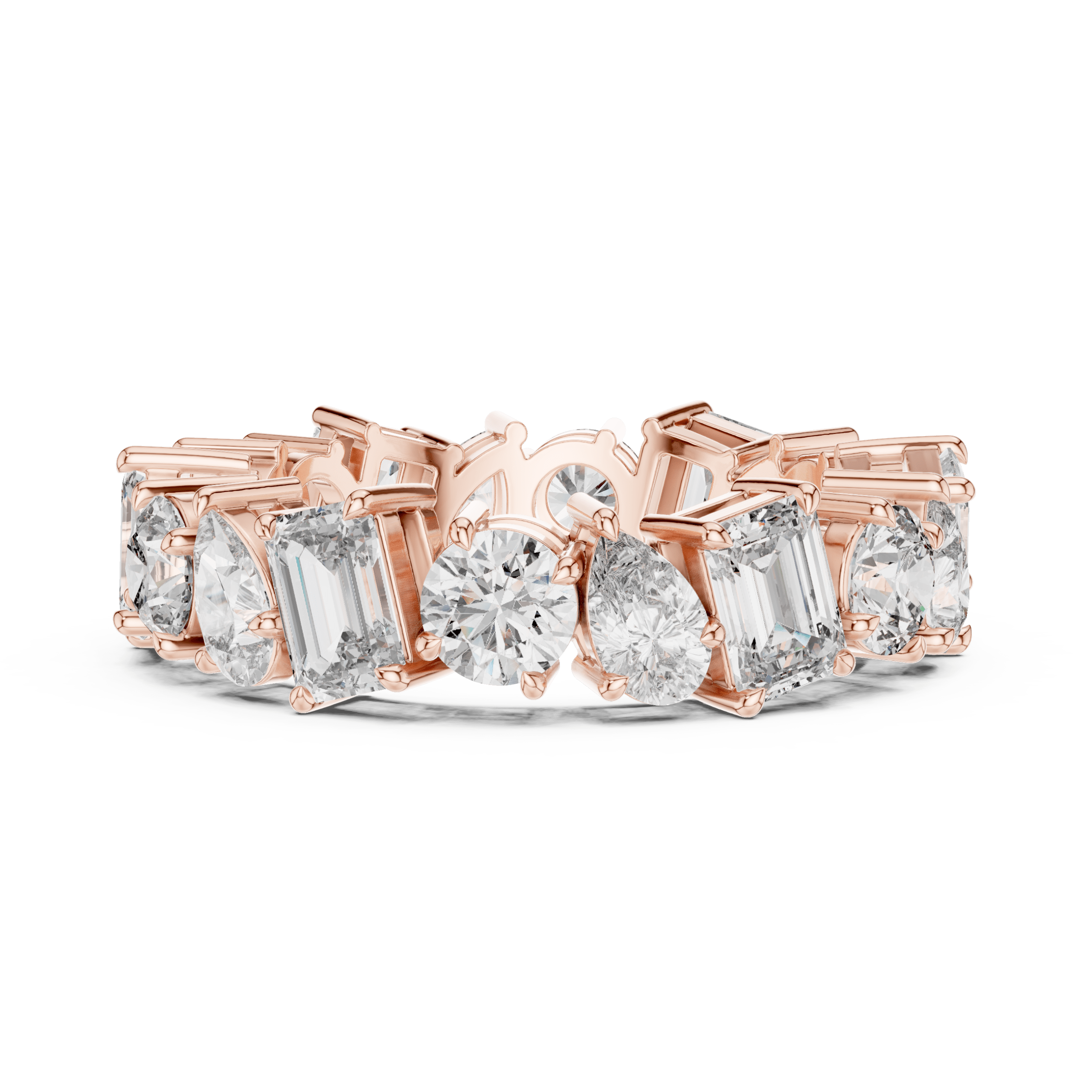 A bold eternity band featuring Round, Cushion, Emerald, Radiant, and Pear-cut diamonds in four-prong basket settings. Available in 18K rose, white, and yellow gold. Perfect for weddings, anniversaries, or statement wear.