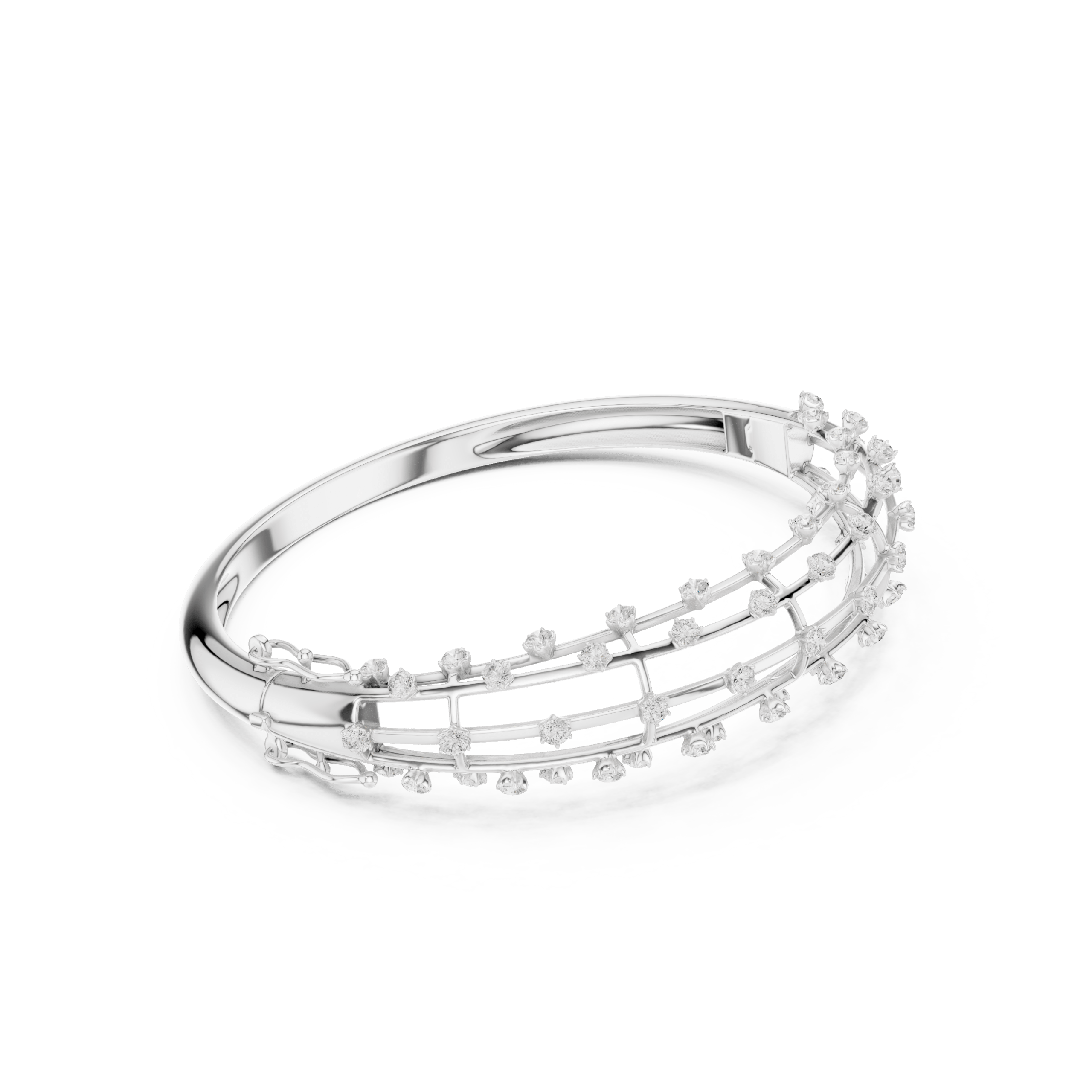 The double-row pave design adds depth and dimension, making this bangle an ideal statement piece when worn alone. At the same time, its clean lines and balanced proportions make it perfect for stacking with other diamond bangles or bracelets for a layered, fashion-forward look. The secure hinged closure ensures ease of wear while providing a snug and comfortable fit throughout the day.