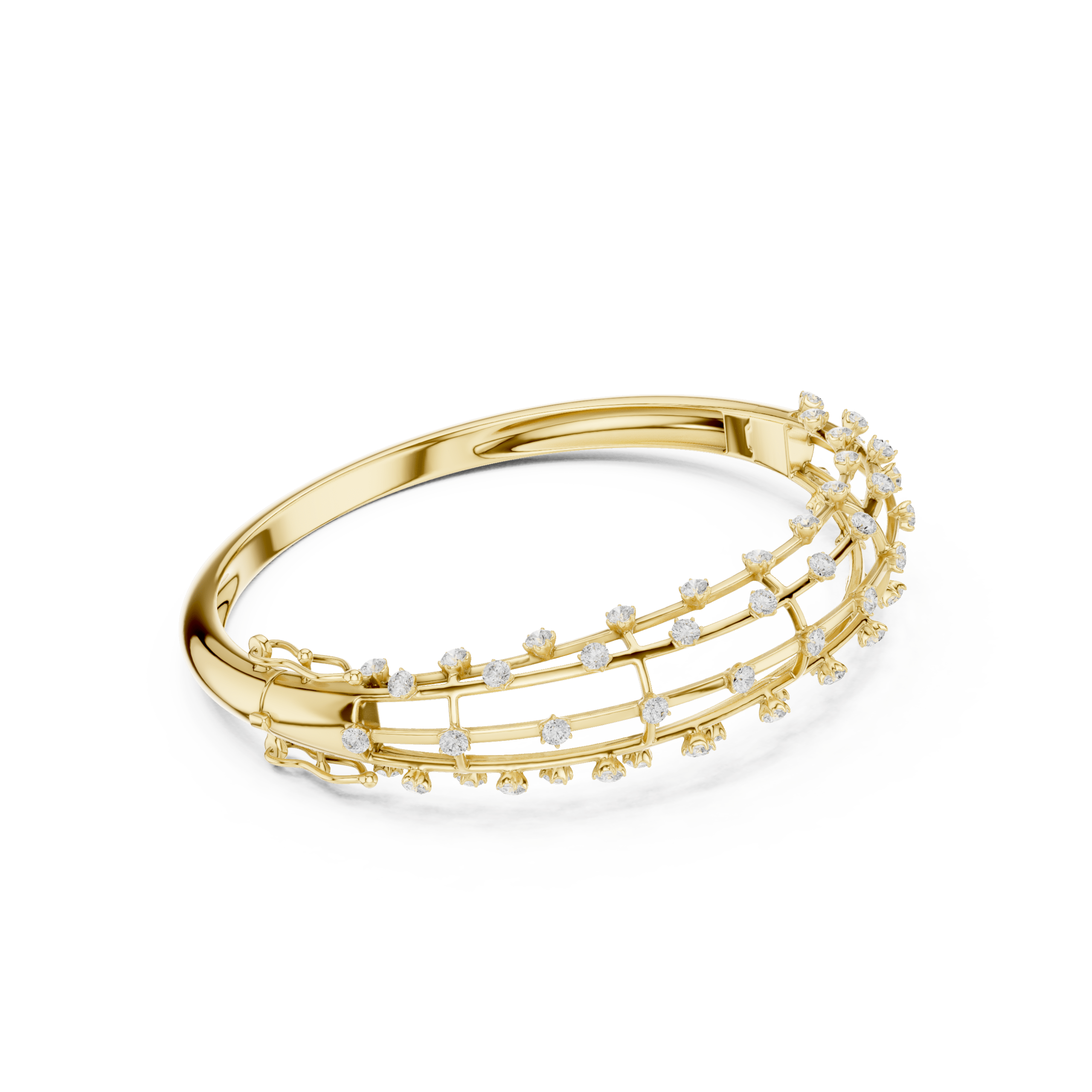 A sleek hinged bangle crafted in rose gold, yellow gold, or white gold, featuring two parallel rows of pave-set round diamonds on a gently tapered band for modern elegance.