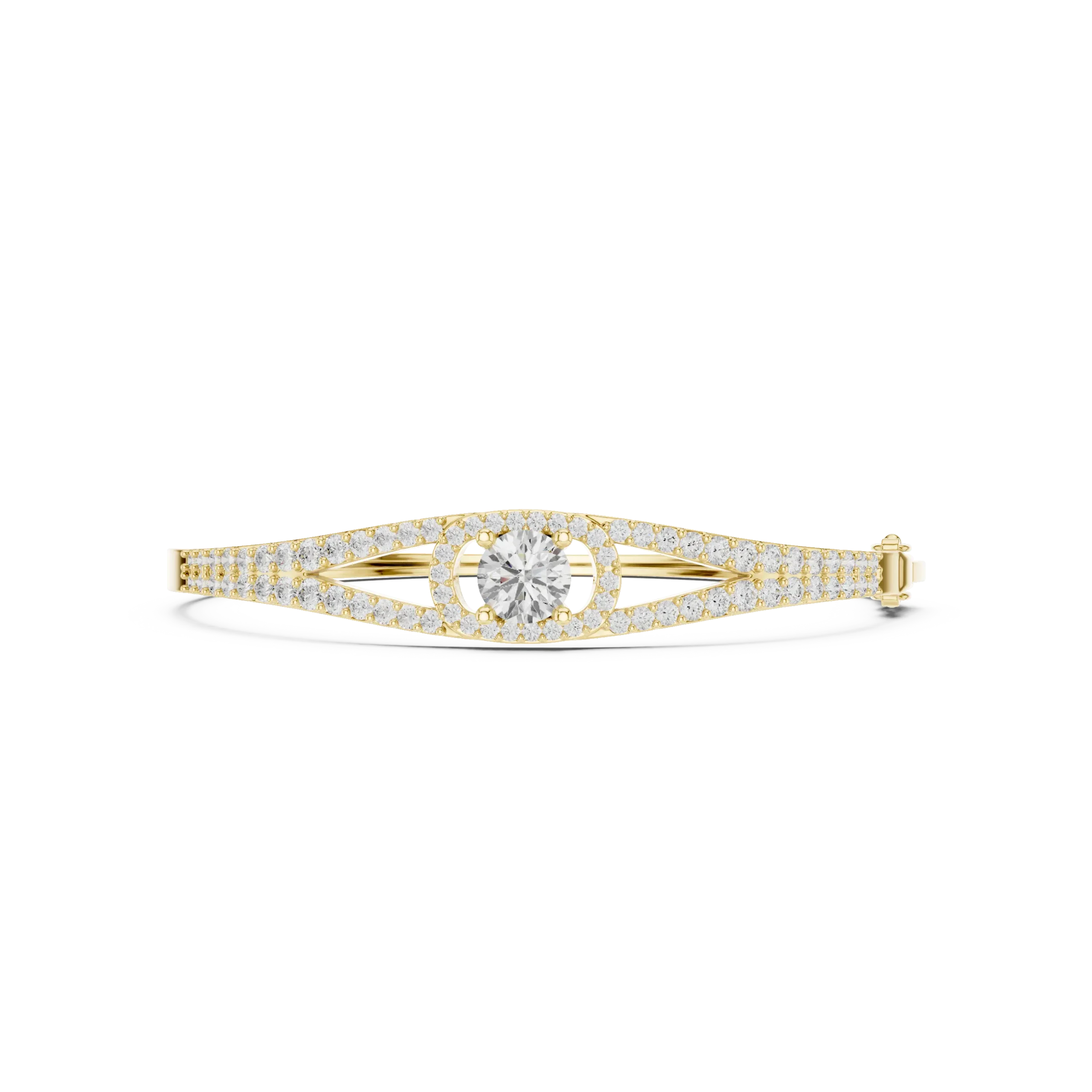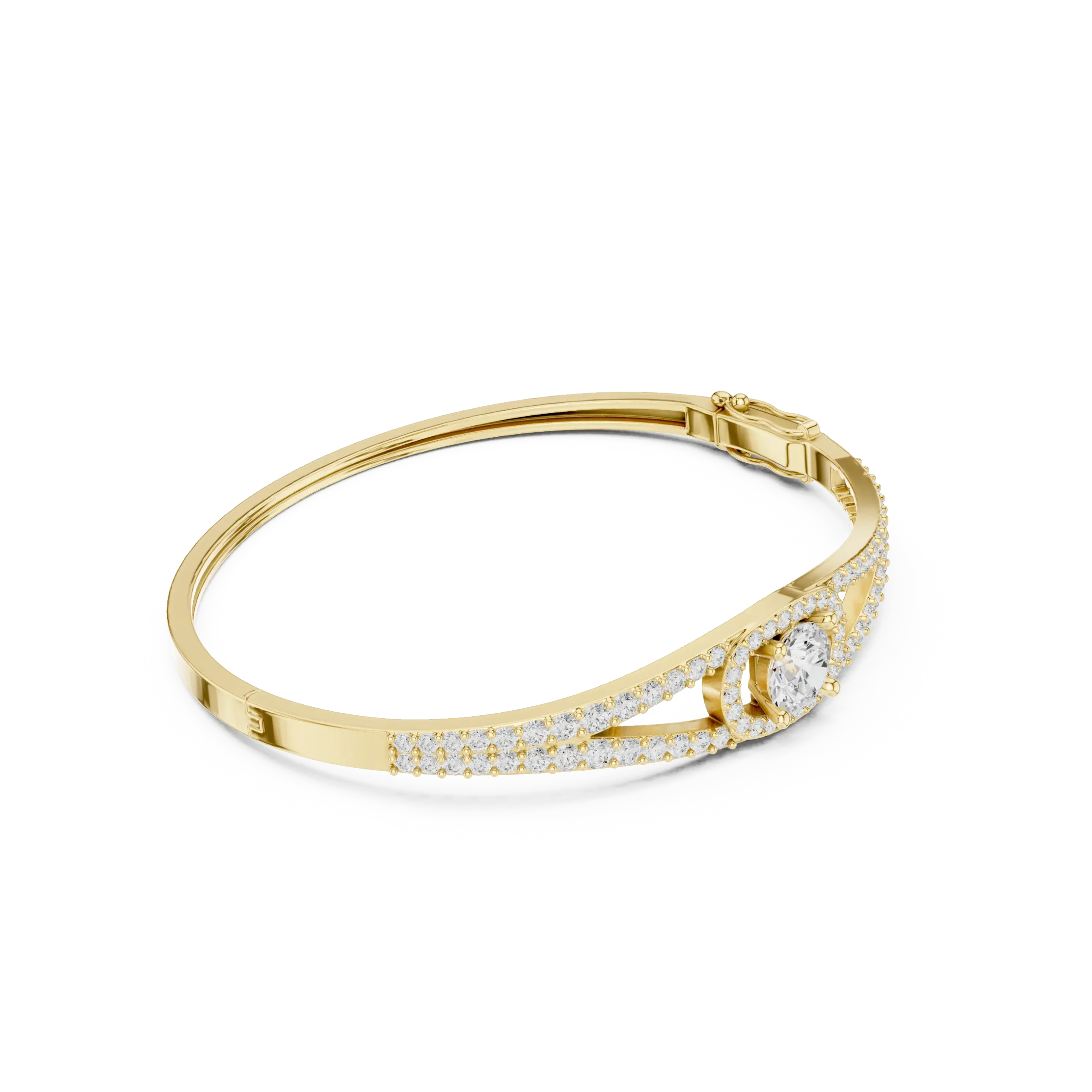 The pave-set diamonds follow the natural contour of the bangle, creating a continuous line of light and elegance. Each stone is carefully positioned to maximize brilliance while preserving a smooth and comfortable fit on the wrist. The round diamond accent adds depth and character, making the bangle stand out without appearing overly ornate.