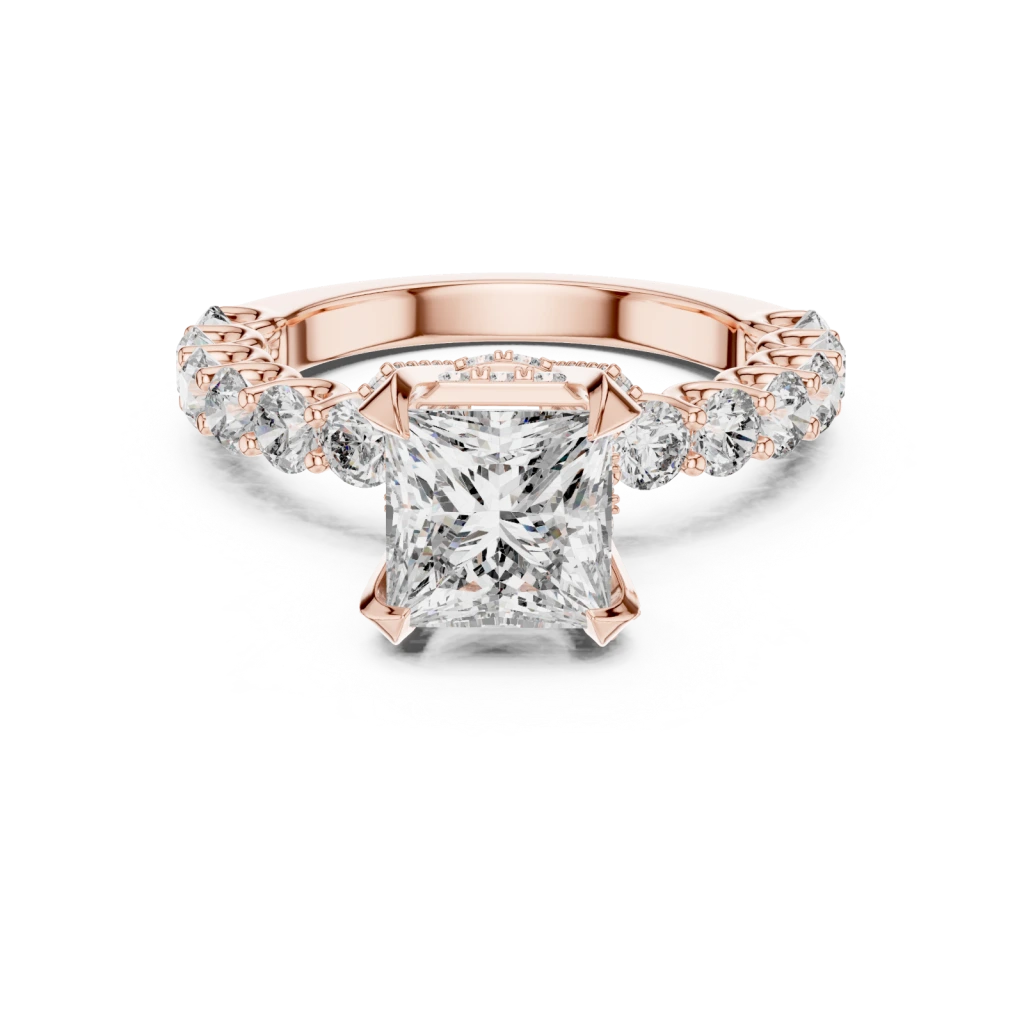 Rose Gold Radiant Cut Diamond Ring with Round Side Diamonds