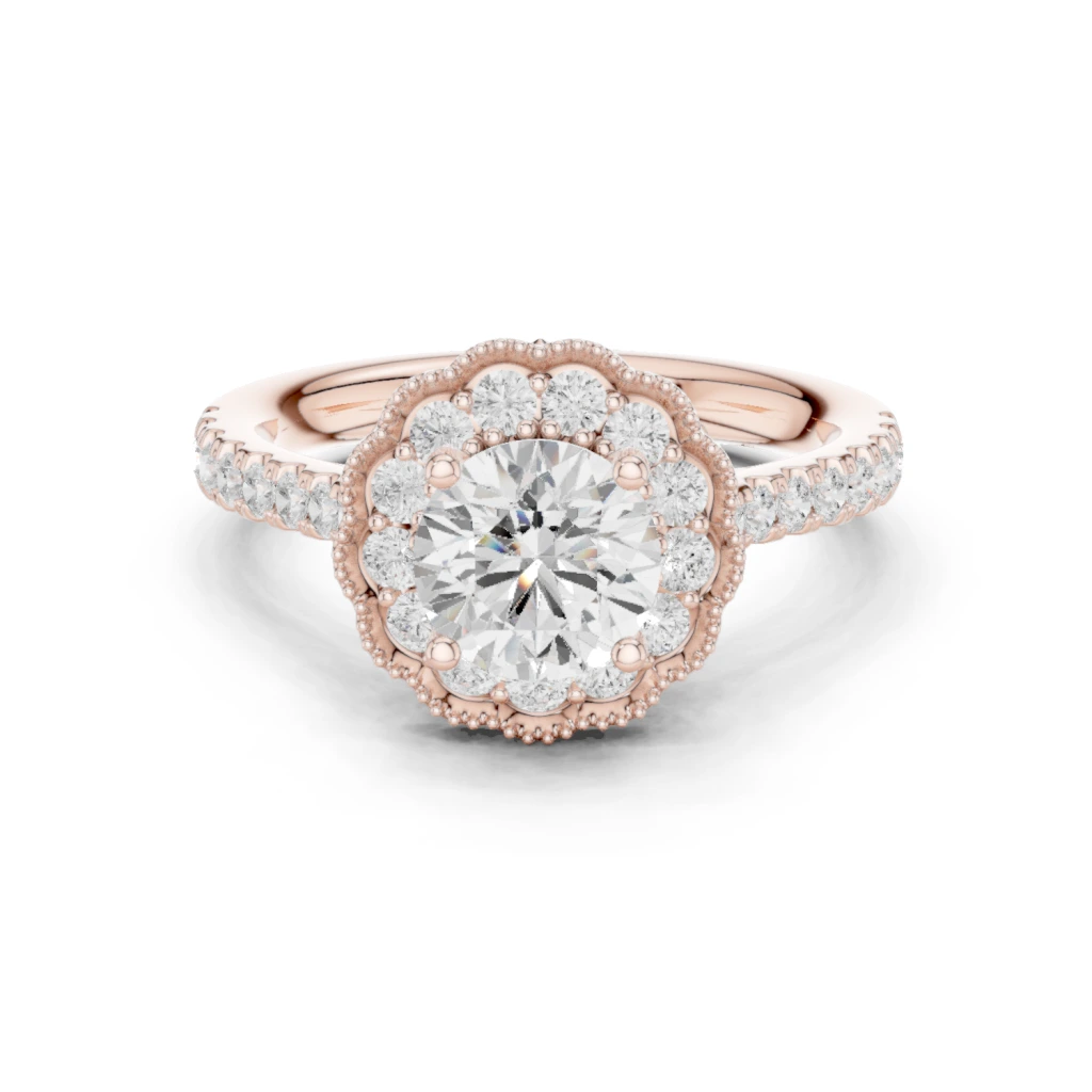 The Rose Gold Round Brilliant Diamond Scalloped Halo Floral Engagement Ring from Diora Jewels captures the essence of romance, artistry, and timeless beauty. Designed to blend classic elegance with vintage-inspired charm, this ring radiates with delicate craftsmanship and luminous sparkle.