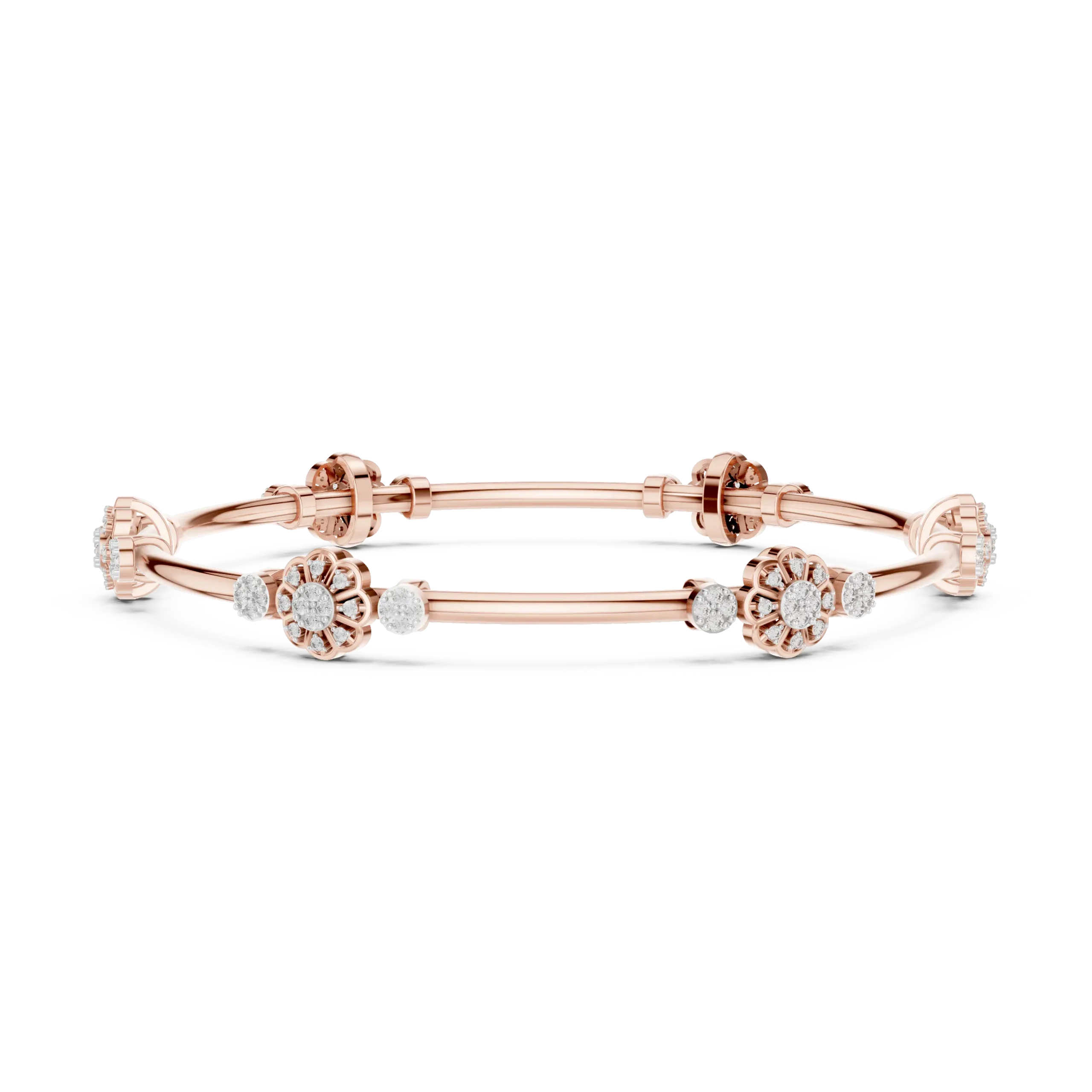 Handcrafted in 18K rose gold, this slender bangle features five symmetrical motifs that encircle the wrist with elegance. Each motif resembles a graceful floral knot, a symbol of love intertwined with strength. Skilled artisans set clusters of Round Cut Diamonds into each design, creating a play of light that captures every glance. The brilliance of the stones contrasts beautifully against the soft blush tone of rose gold, producing a subtle yet captivating sparkle.