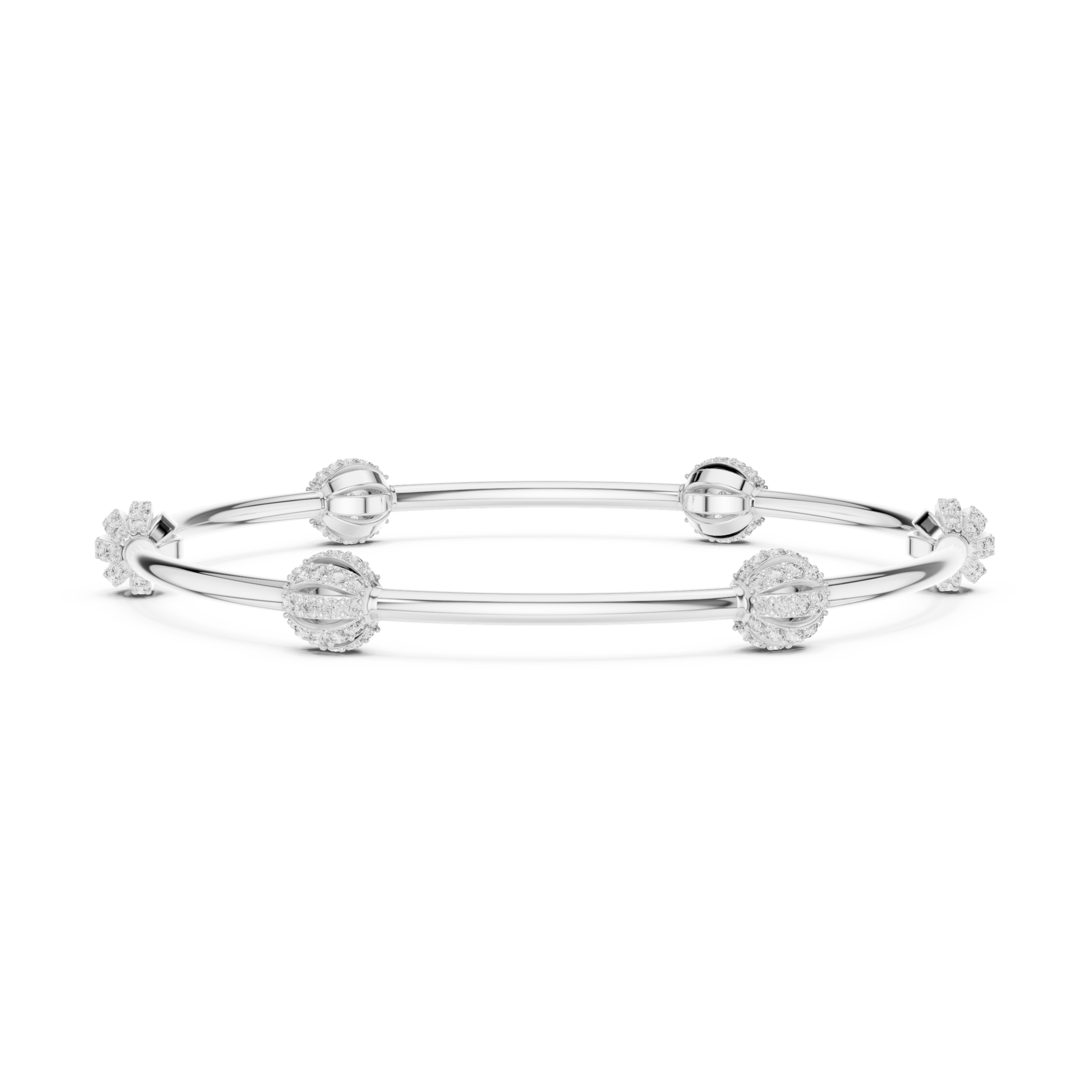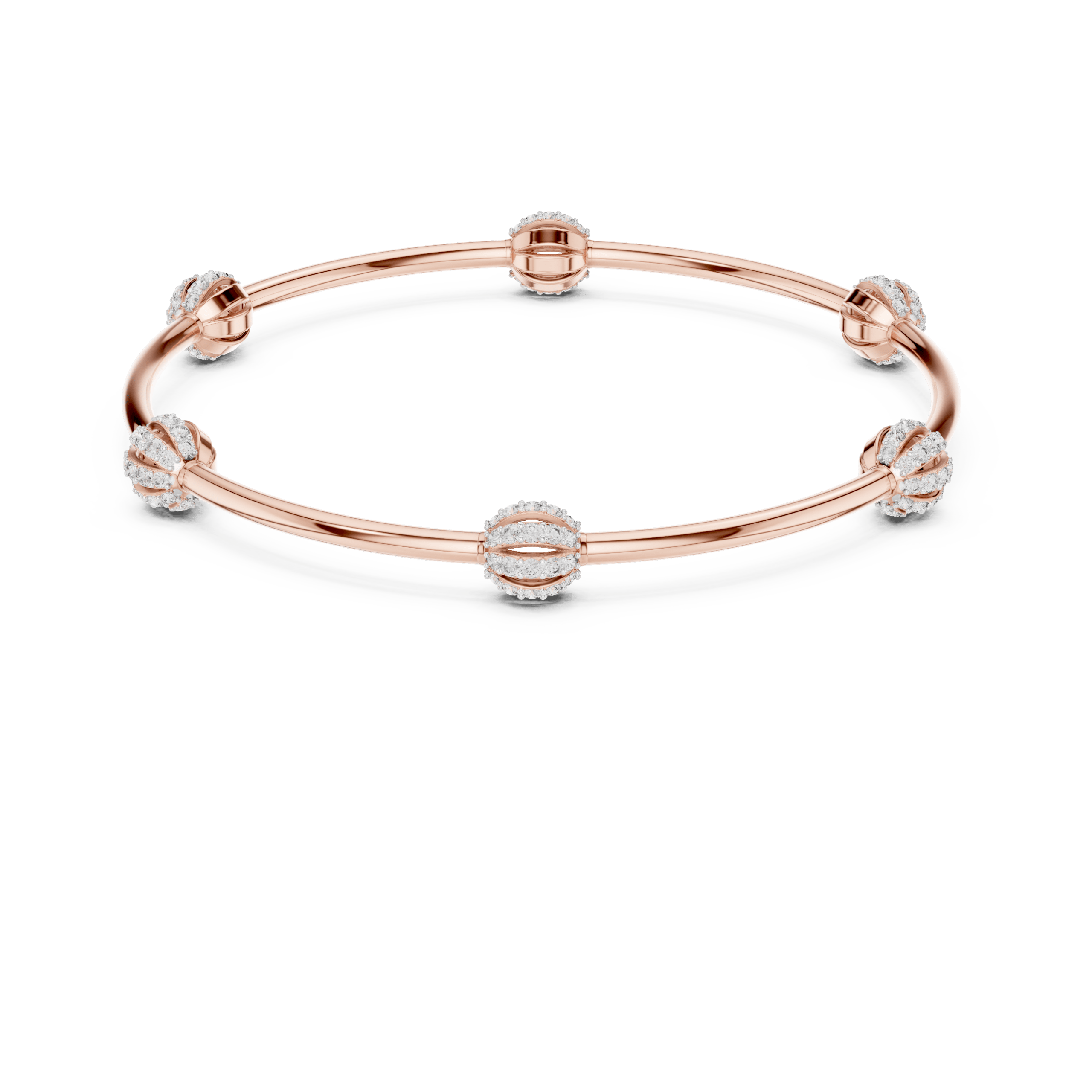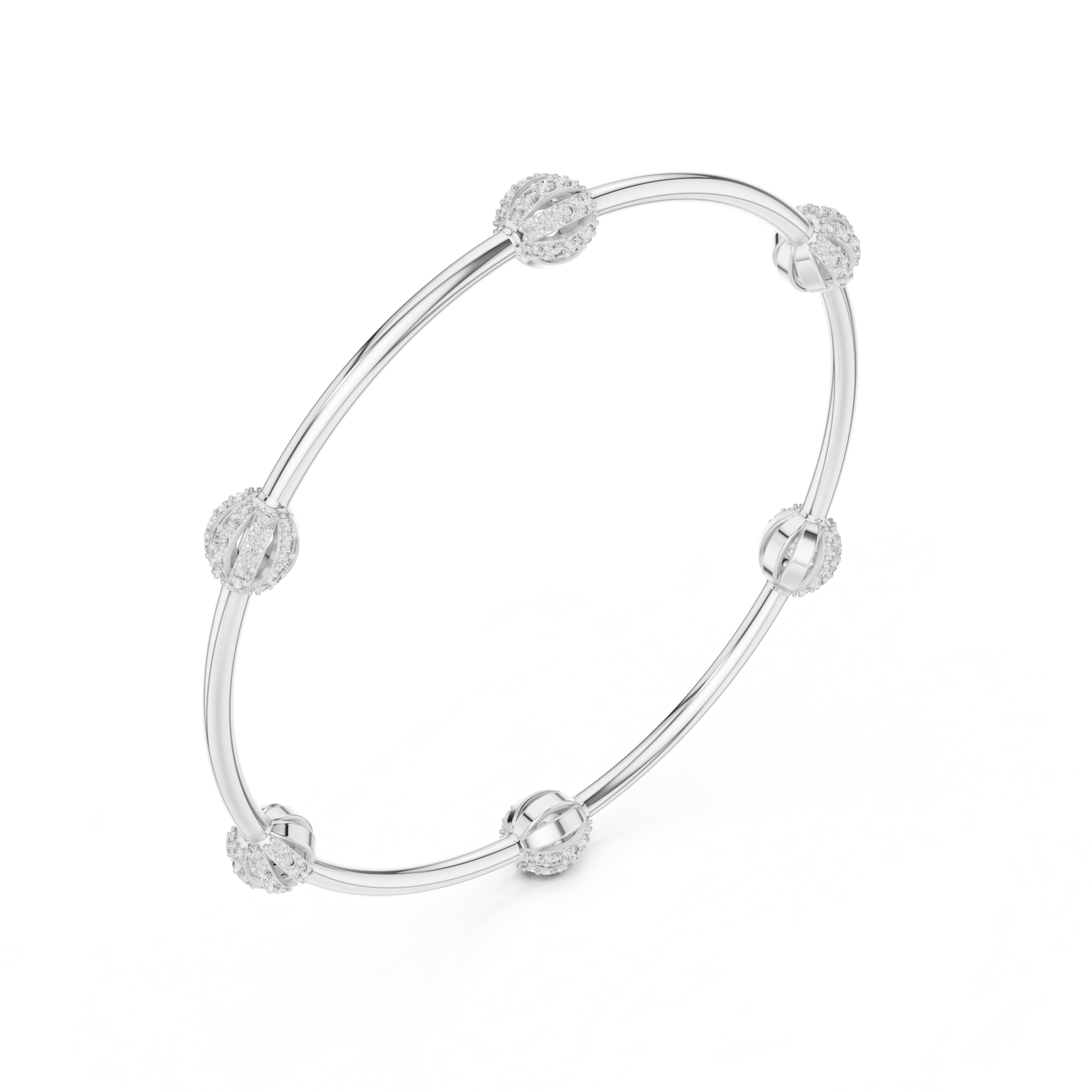 Crafted in 18K rose gold, the Rose Gold Diamond Pave Ball Bangle is a celebration of light and form. The slender, polished band encircles the wrist with effortless grace. Along its circumference, five stunning spheres shimmer with pave-set Round Brilliant Diamonds, creating a captivating play of brilliance with every gesture.