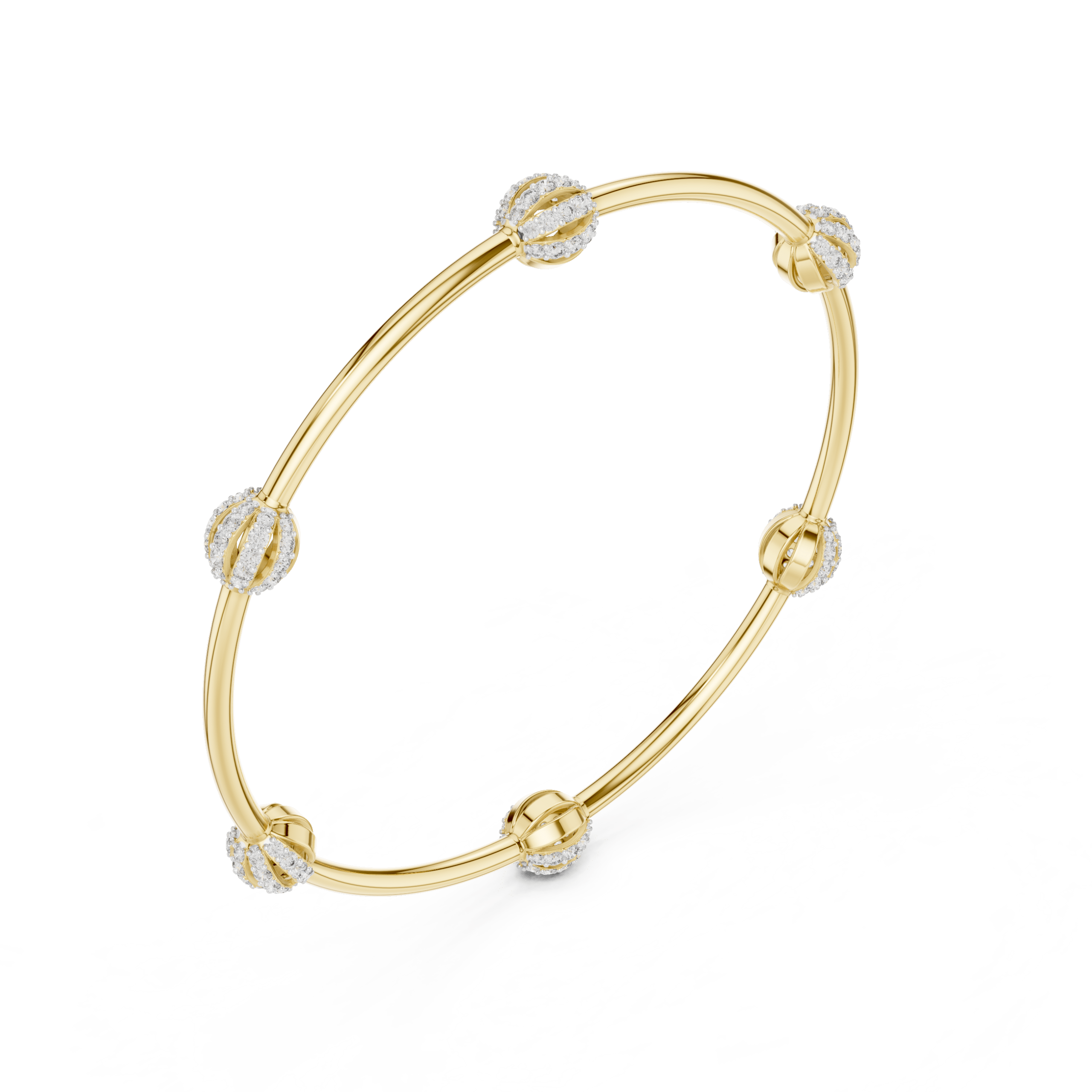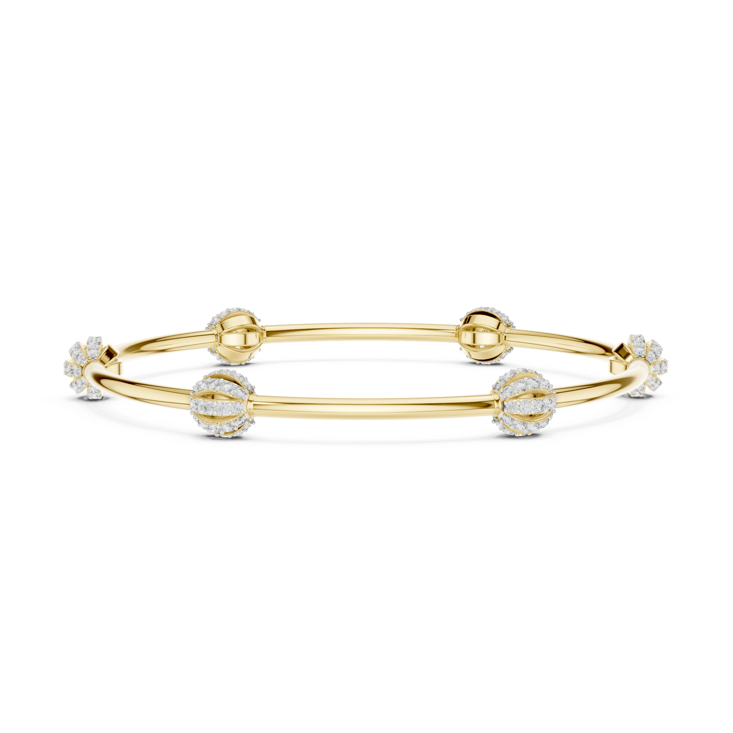 The smooth gold sections contrast beautifully with the diamond-encrusted spheres, offering a look that is both elegant and modern. This refined contrast gives the piece a delicate balance — airy, luminous, and full of character. The hidden hinged clasp ensures a seamless finish, adding comfort and security without interrupting the design’s harmony.