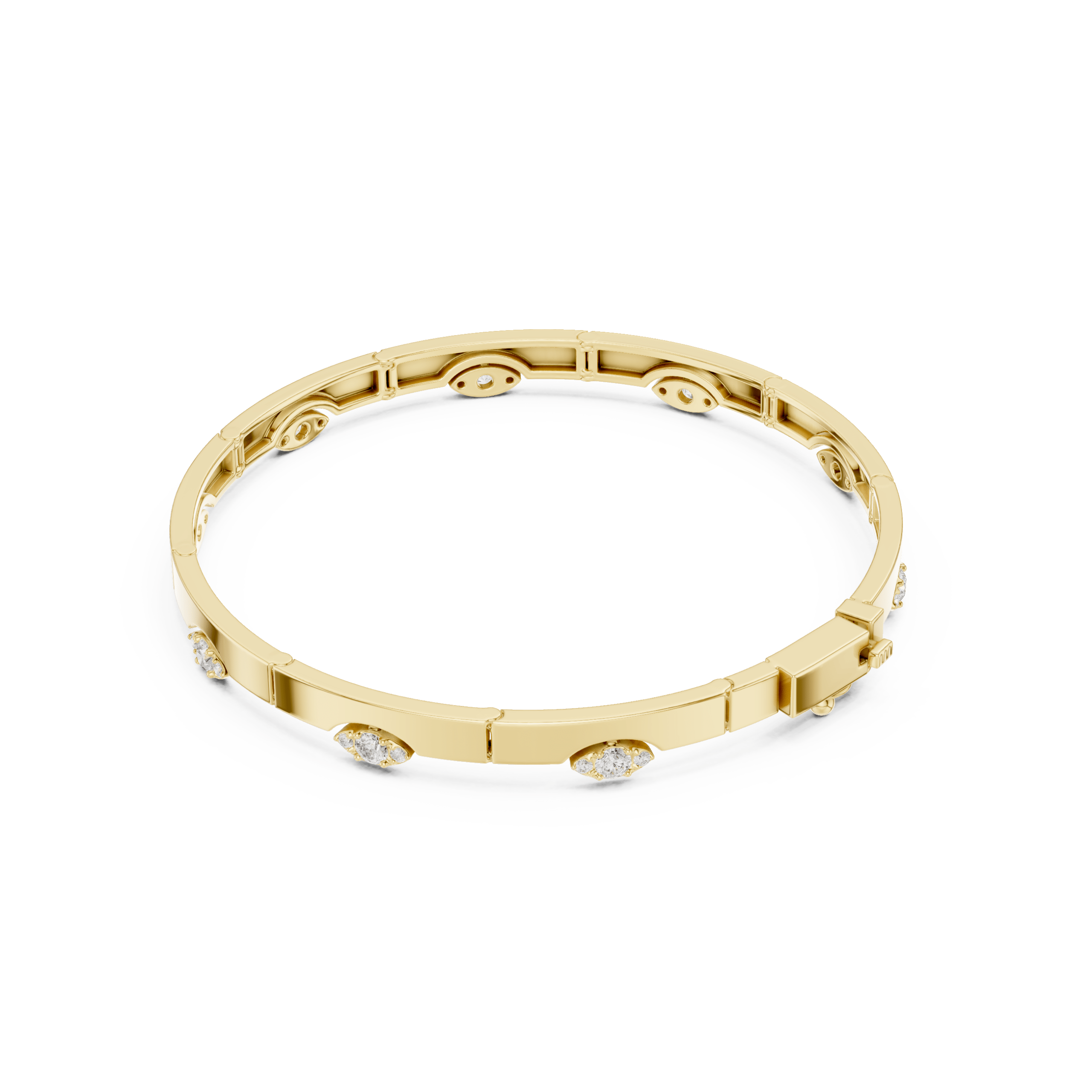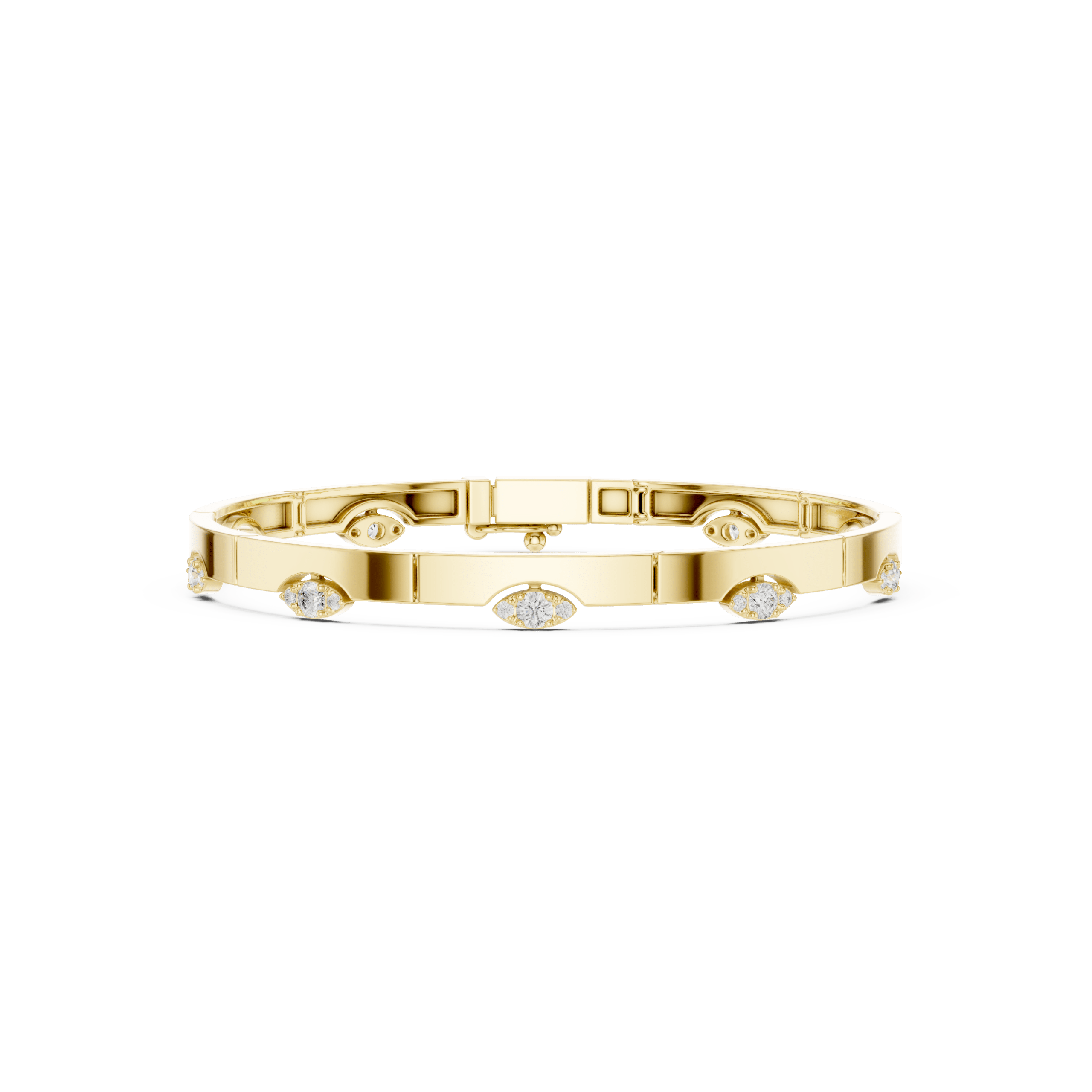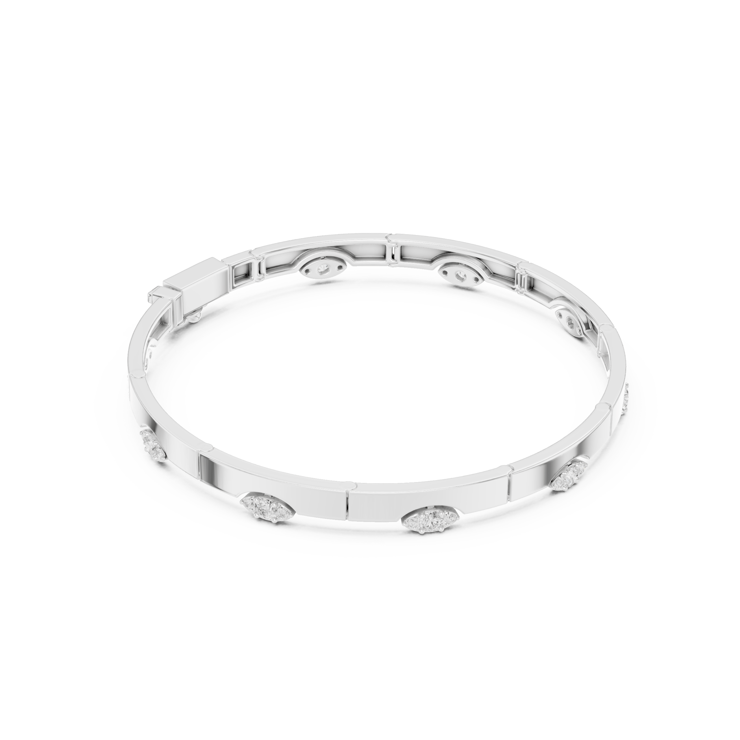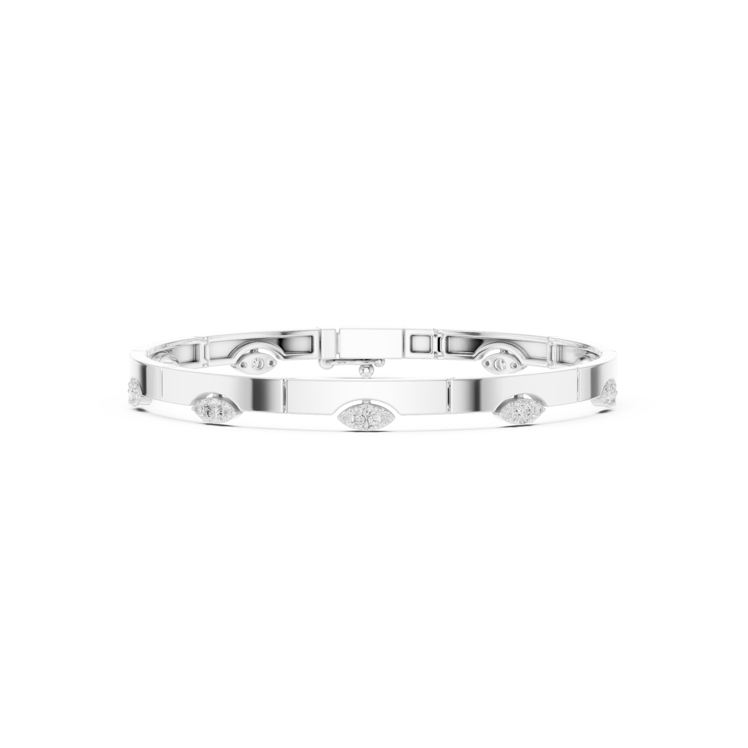 The bangle’s face features a continuous array of mixed-cut diamonds. These include Marquise, Oval, Radiant, and Baguette cuts. Each diamond is carefully set to maximize light reflection. This produces a dynamic interplay of sparkle, texture, and dimension. The combination of shapes and facets creates a visually intriguing effect. As a result, the cuff shines brilliantly under any lighting condition. This fusion of classic and contemporary diamond cuts gives the bracelet a unique artistic flair. Therefore, it is a must-have for collectors and fashion-forward jewelry lovers alike.