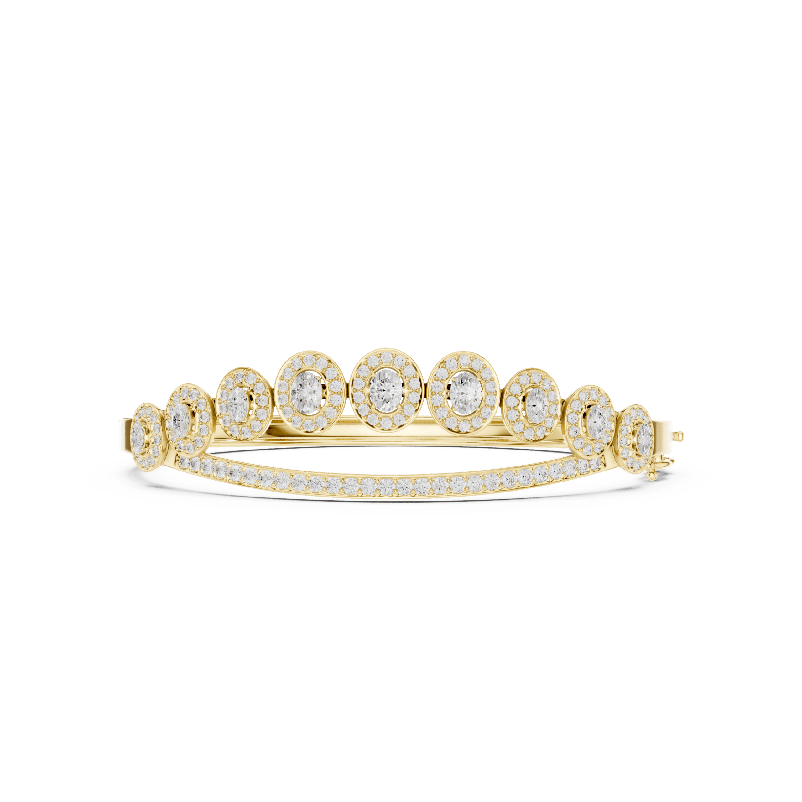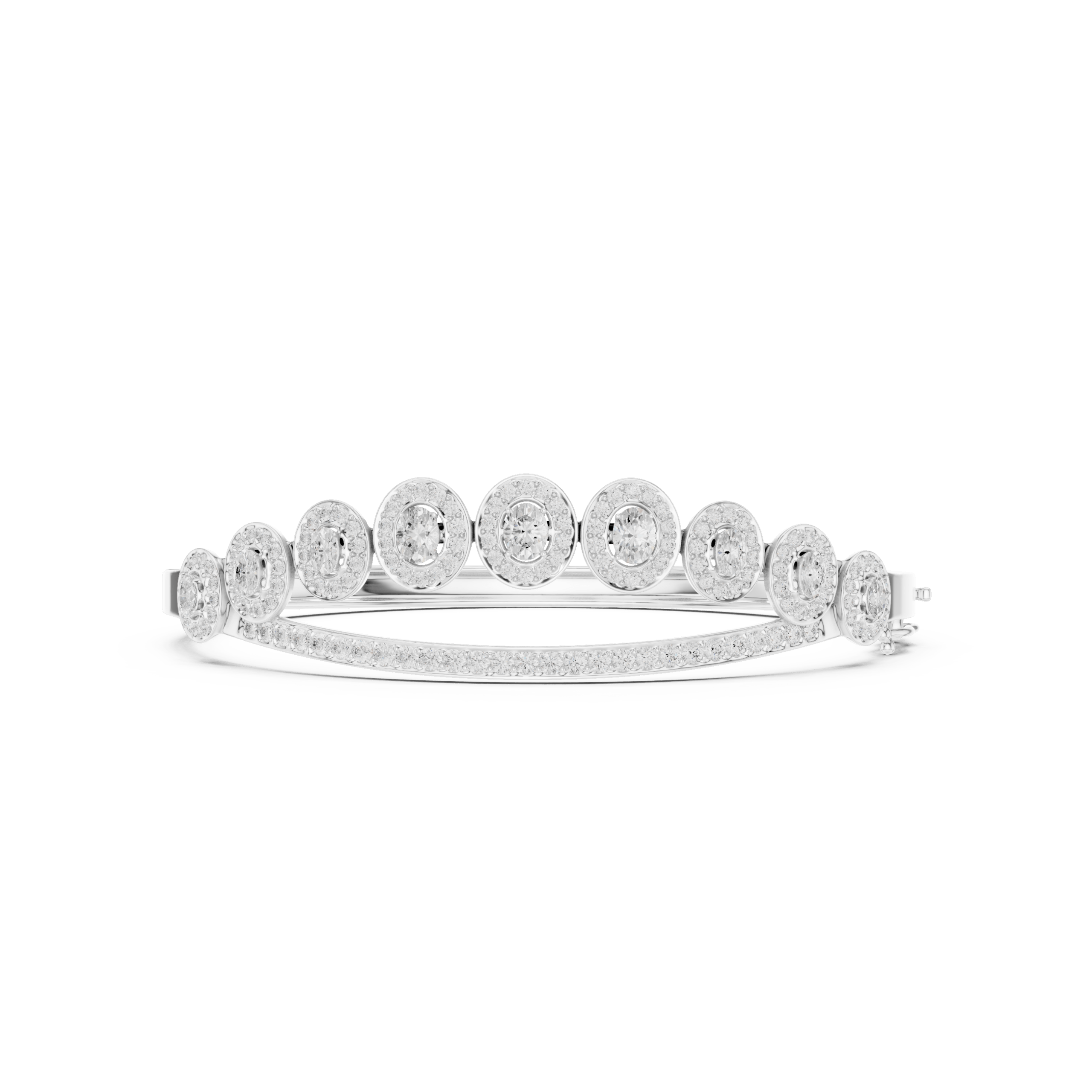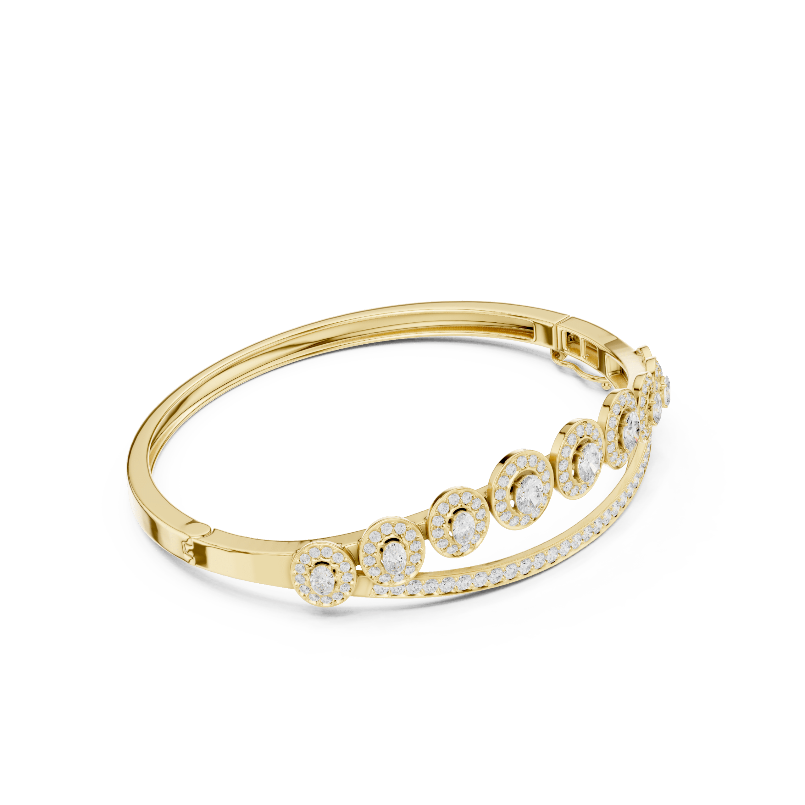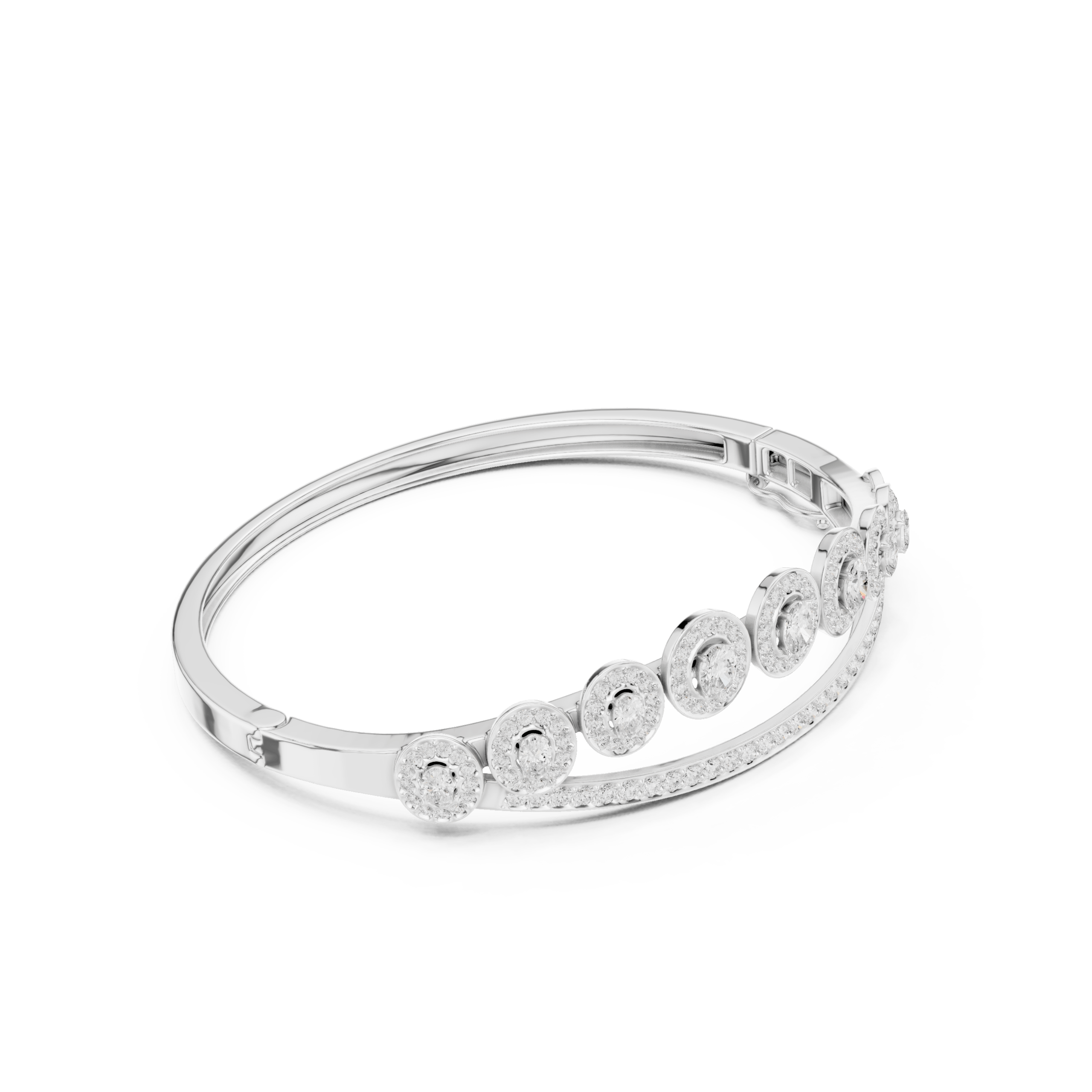 This versatile bangle is perfect for layering with other bracelets or wearing solo as a minimalist statement piece. The open cuff design not only allows for easy wear but also highlights the refined craftsmanship and sparkling diamonds from every angle. The combination of a solitaire and a circle cluster offers a unique interplay of classic and contemporary design elements, making it suitable for both casual and formal occasions.