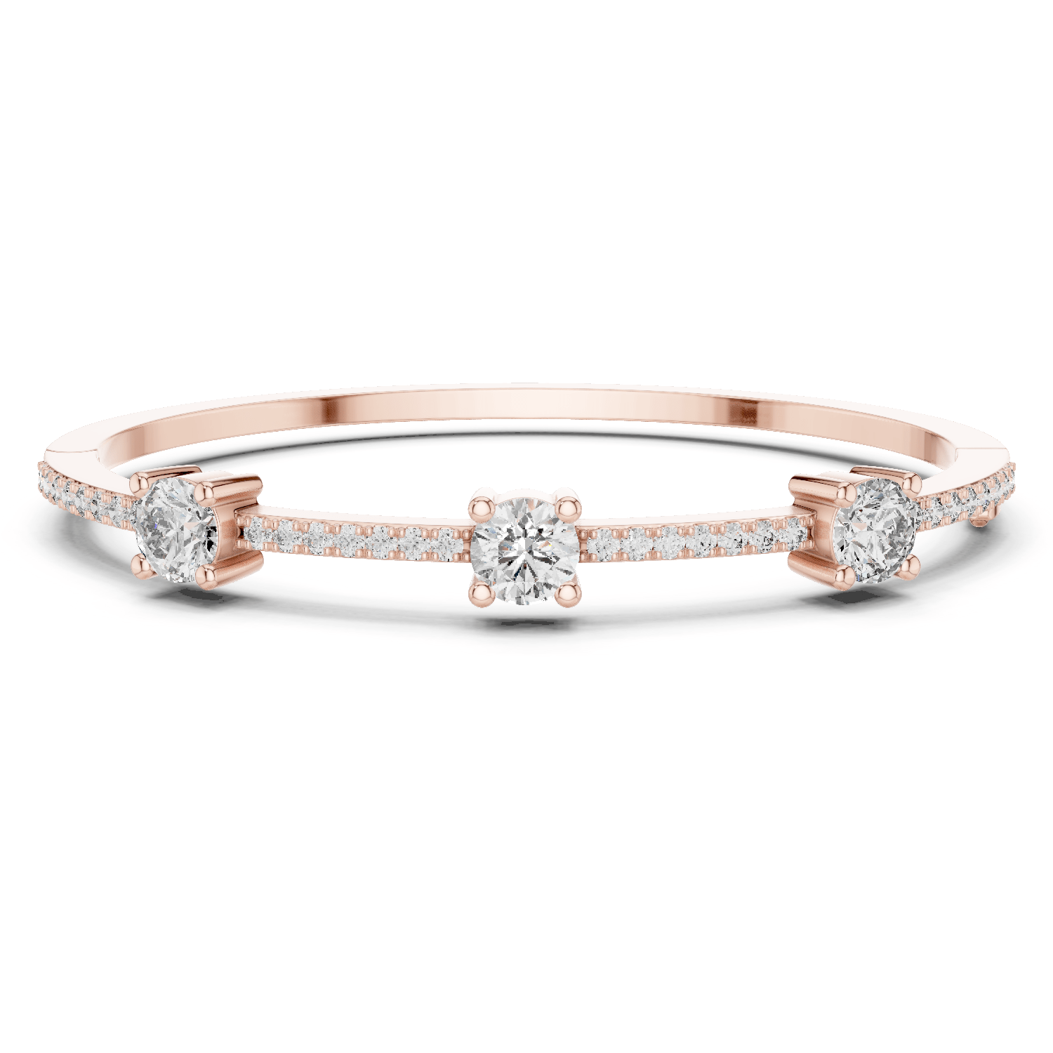 A refined Trio Round Diamond Pave Bangle featuring three prong-set round diamonds linked by a delicate pave diamond band, crafted in rose gold and also available in yellow and white gold