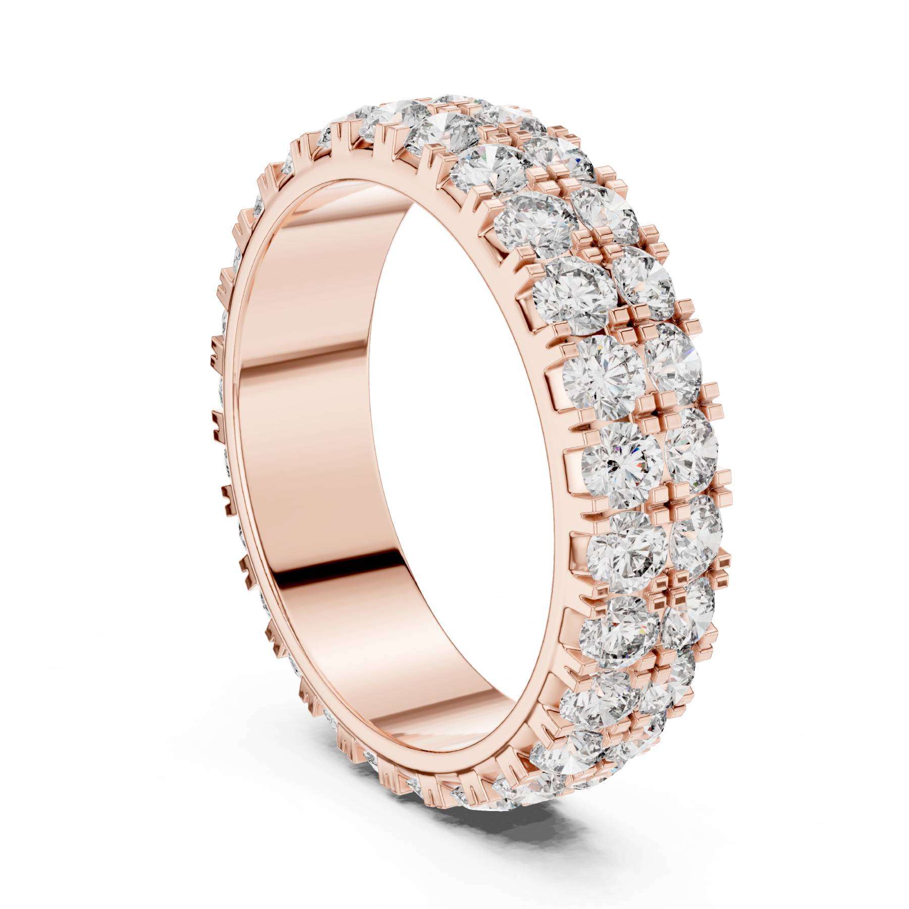 It features two full rows of Round Brilliant Cut Diamonds arranged in perfect symmetry. Each stone is hand-set to enhance fire and sparkle, ensuring light dances across the surface from every angle. Together, the rows create a continuous ribbon of brilliance that wraps elegantly around the finger.